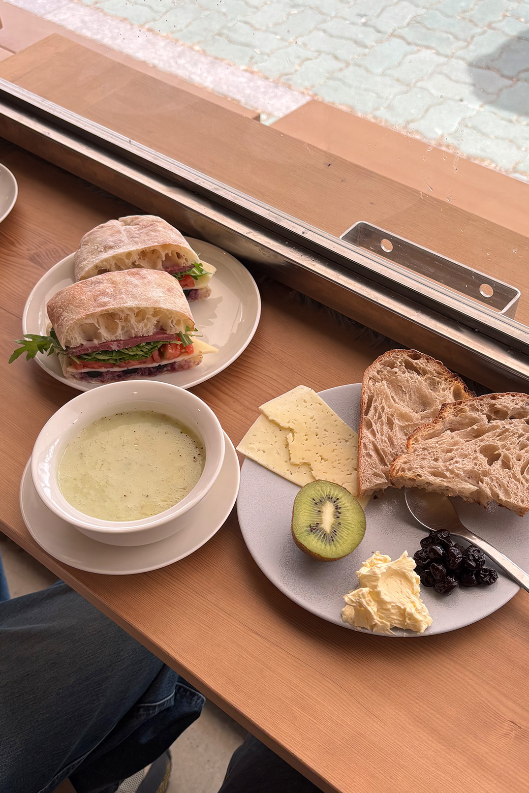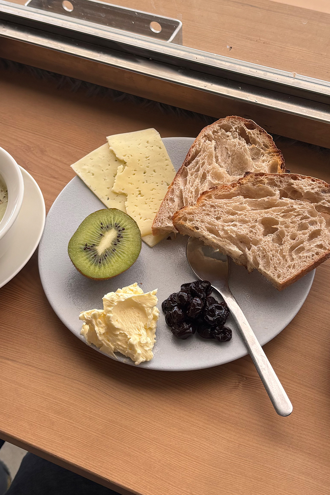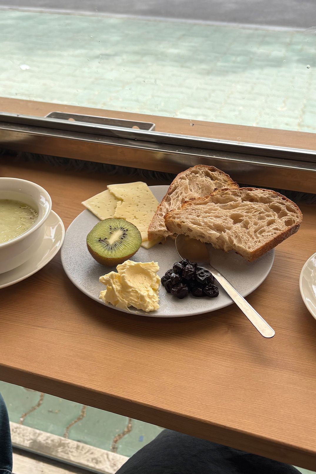 계절 과일, 사워도우, 치즈, 휩버터까지 균형 있게 담겨 있었고,